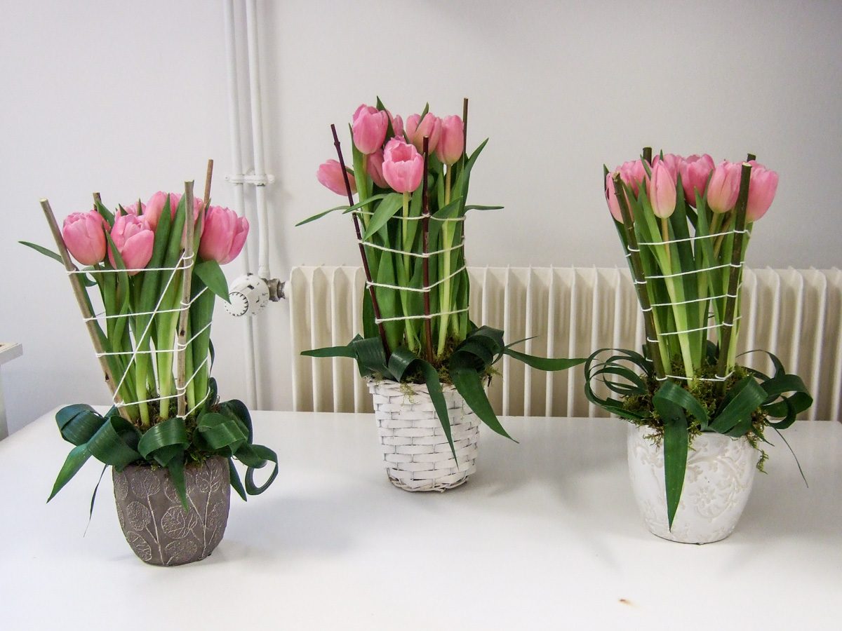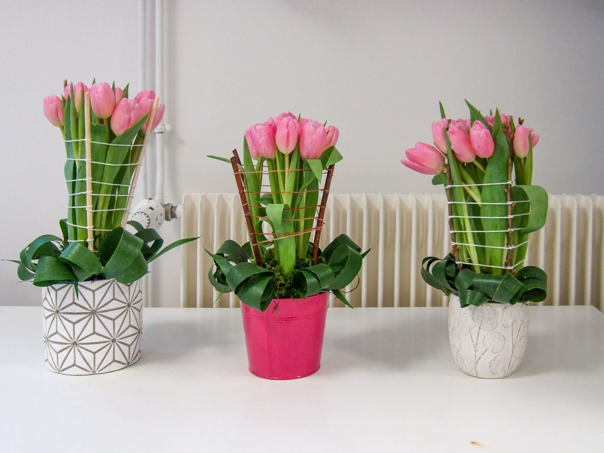 Cache pot, tulipes, aspidistras, mousse des bois, bois, laine ...