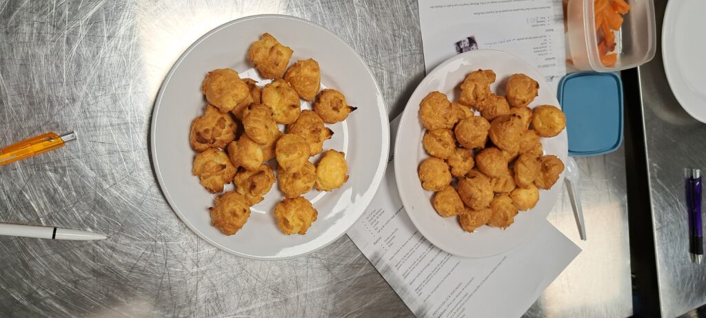 Monique nous a démontré sa recette de blinis puis Olga a réalisé des gougères au conté et Marie-Odile nous a régalé avec des barquettes de pétoncles aux poivrons.