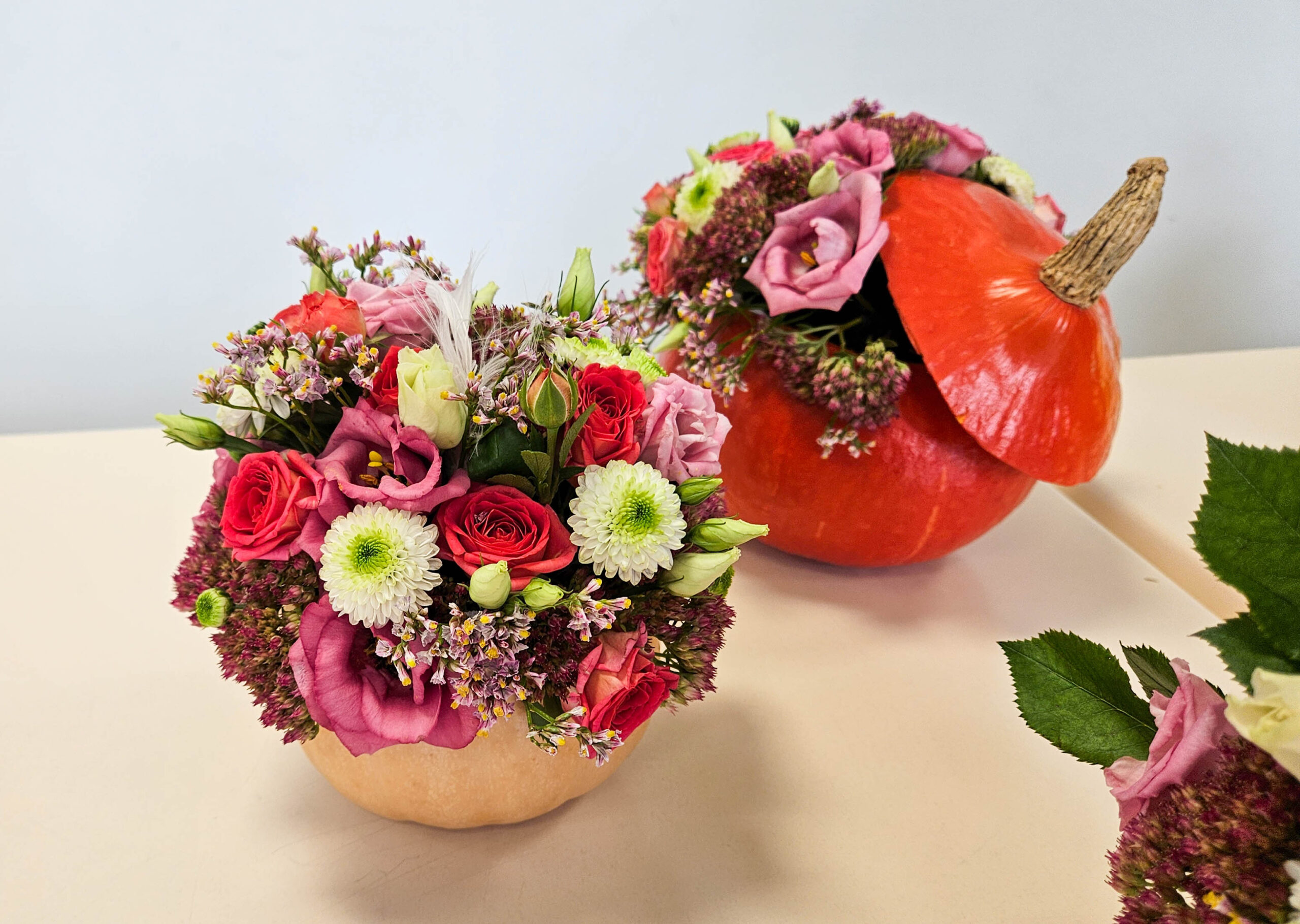 Dans une courge, composition de roses, sedum, lisianthus, santinis blancs , limonium.
