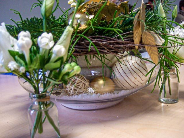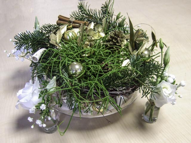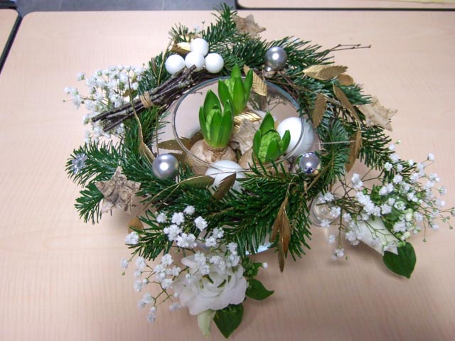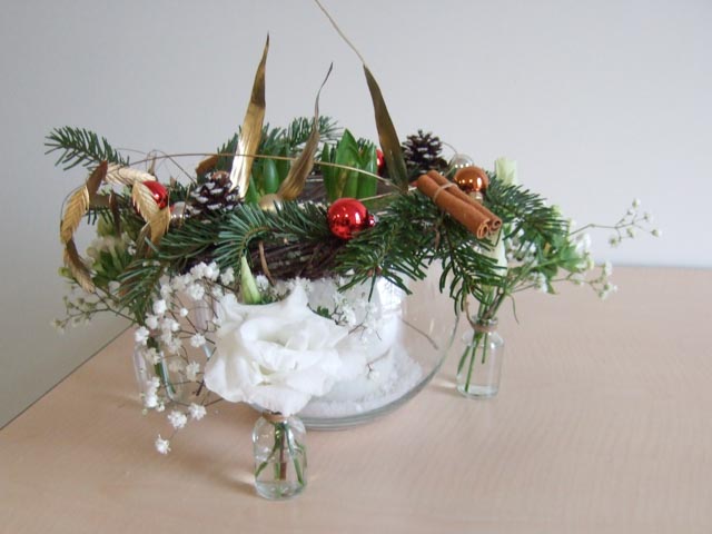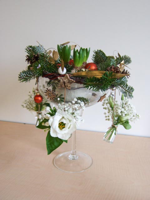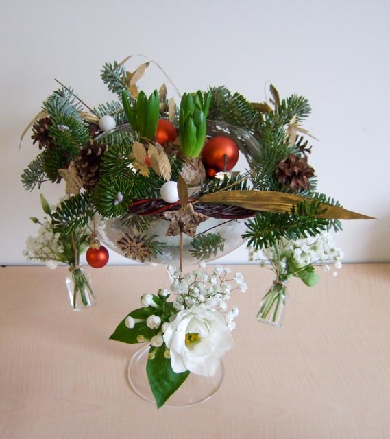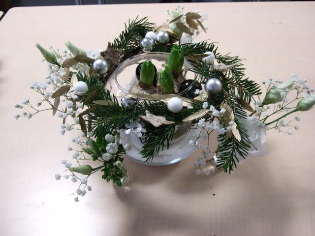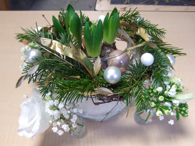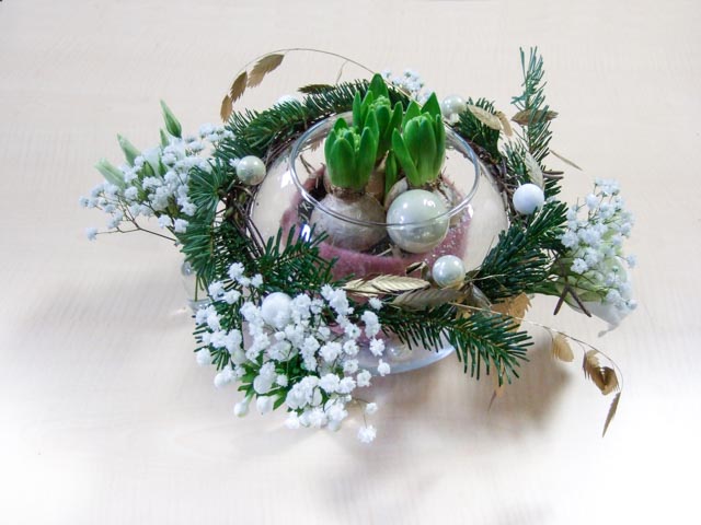 Vase boule, jacinthes, lisianthus, gypsophile, sapin, bouleau, graminées, décos de Noel ...