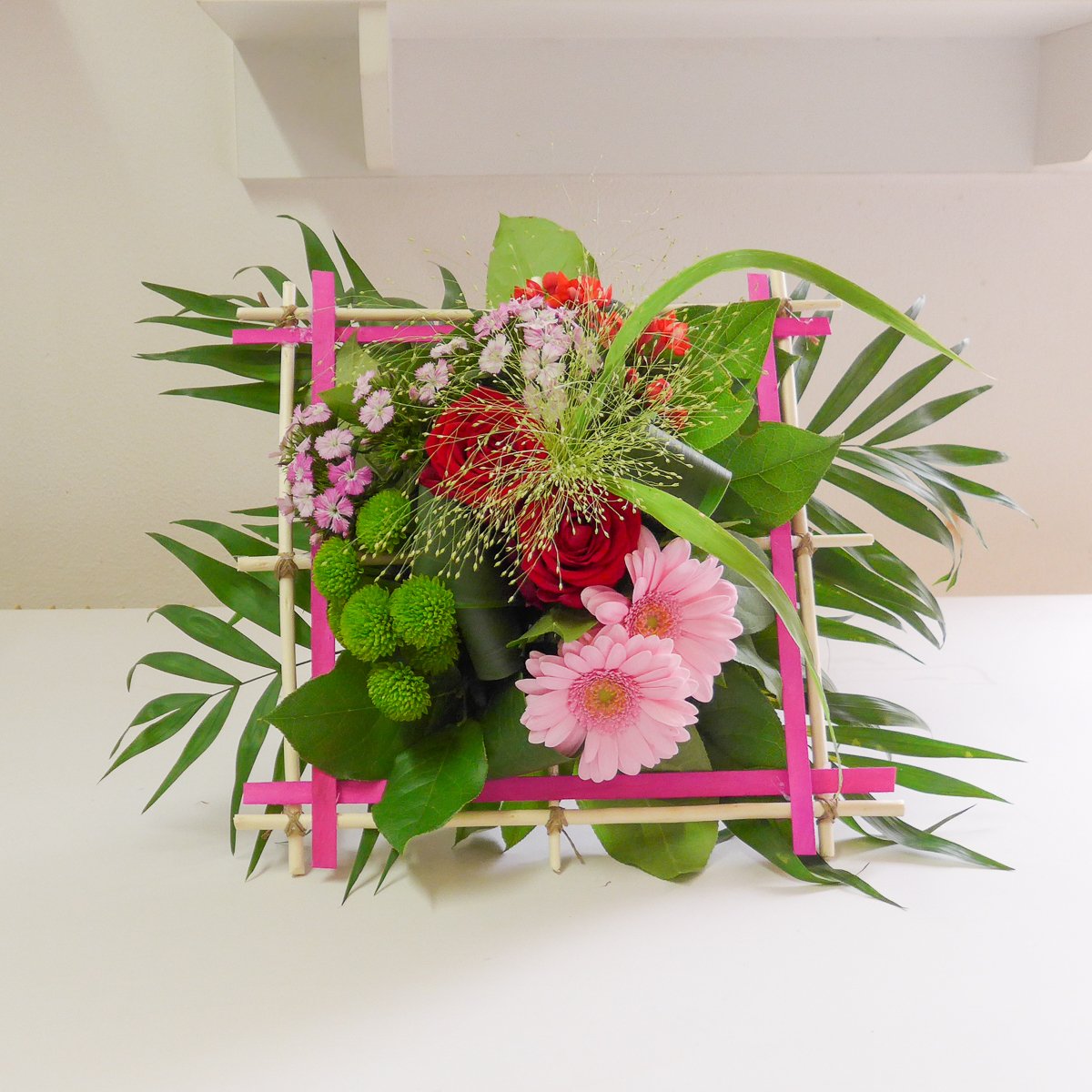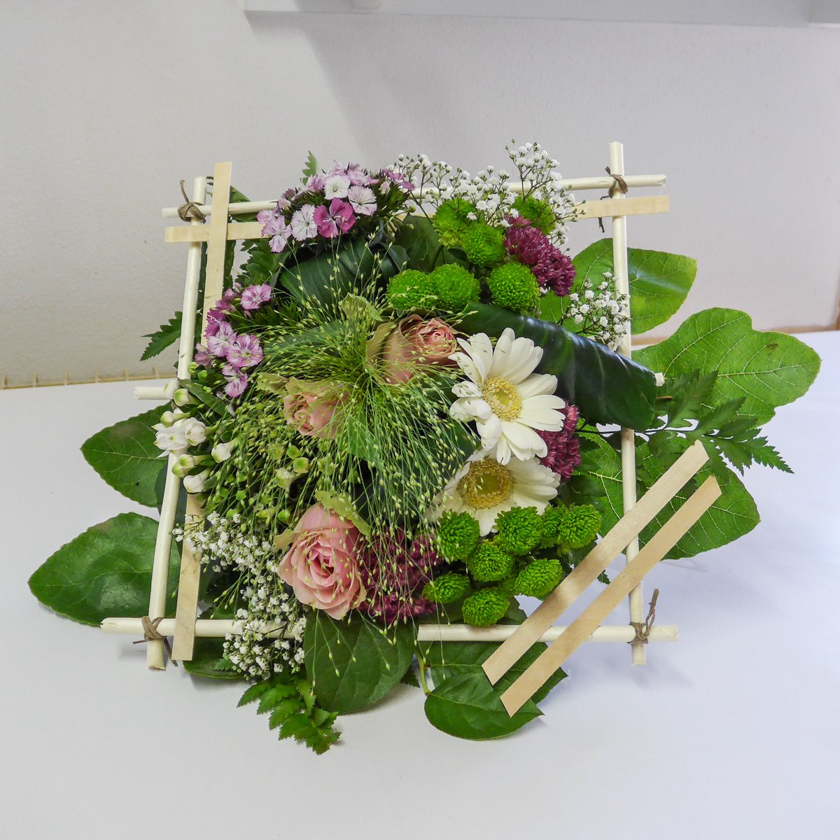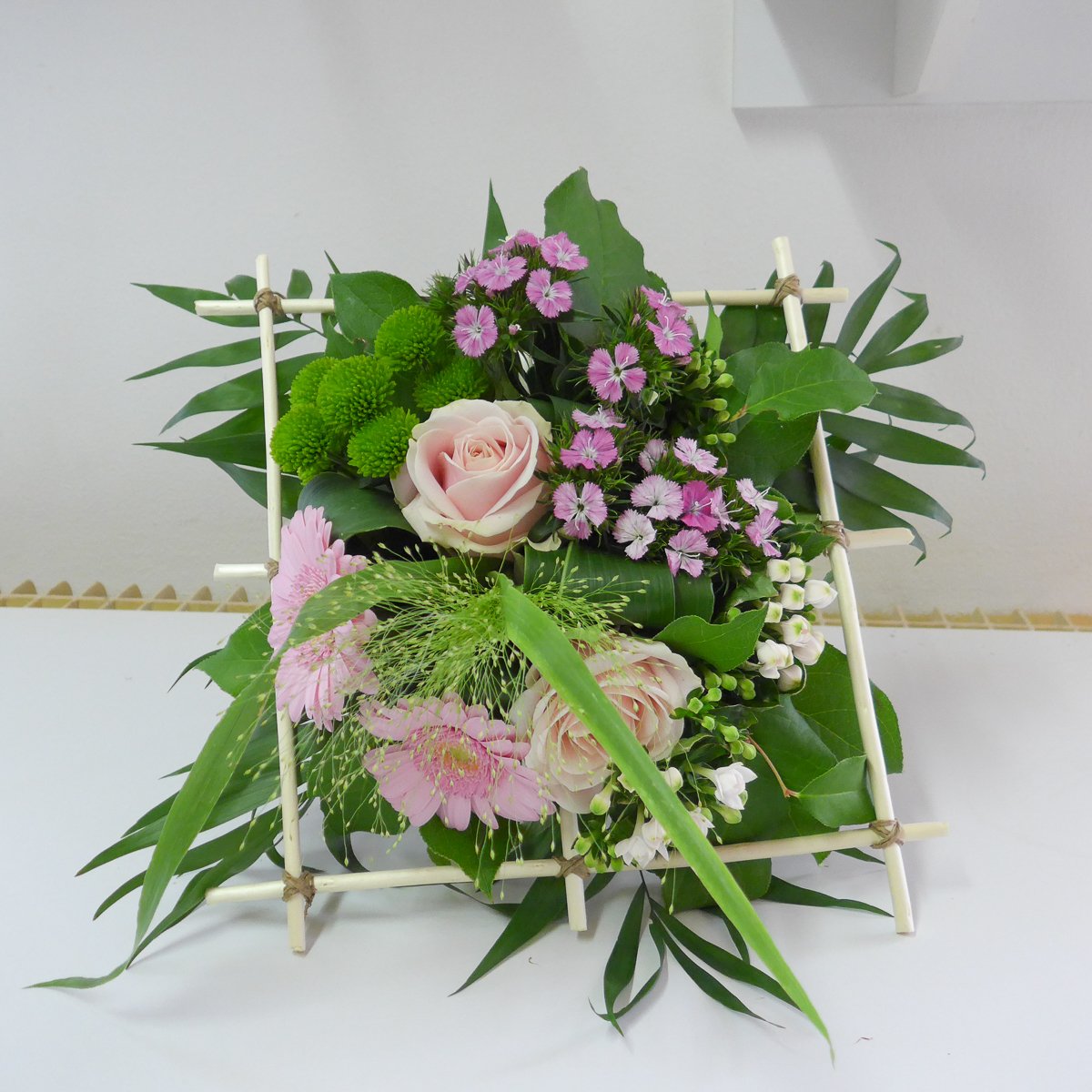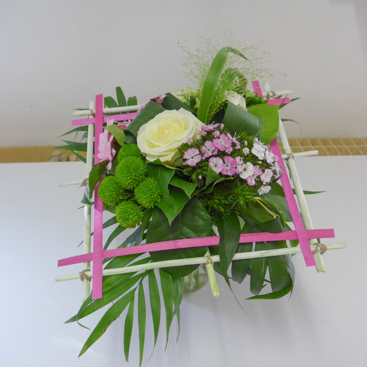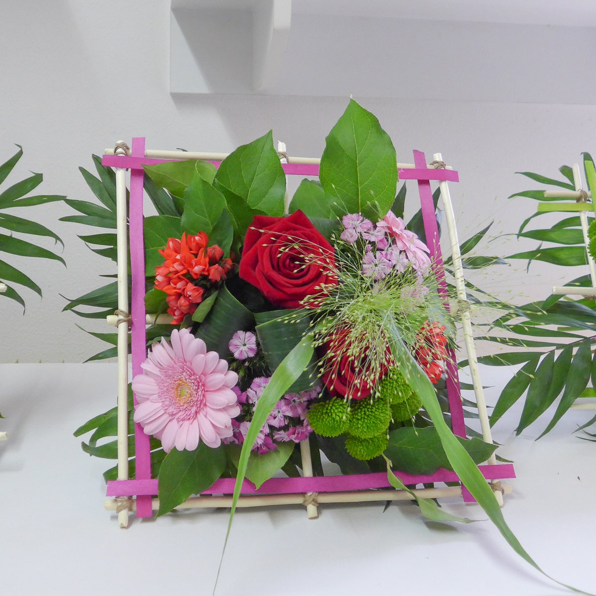 Les 3 groupes ont pu réaliser une structure carrée pour y inclure un bouquet coloré grâce aux conseils de Cécile.