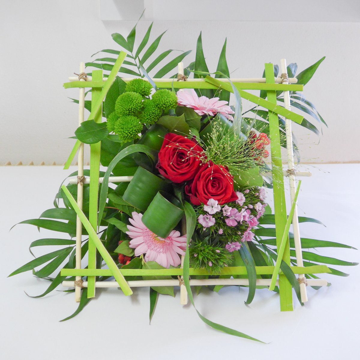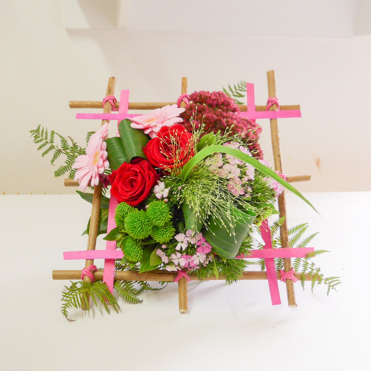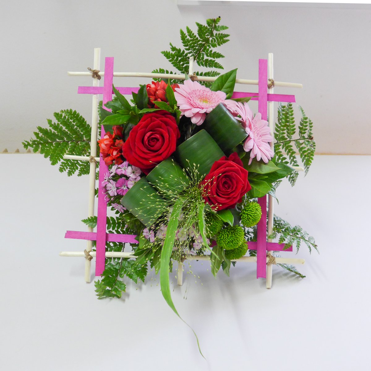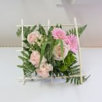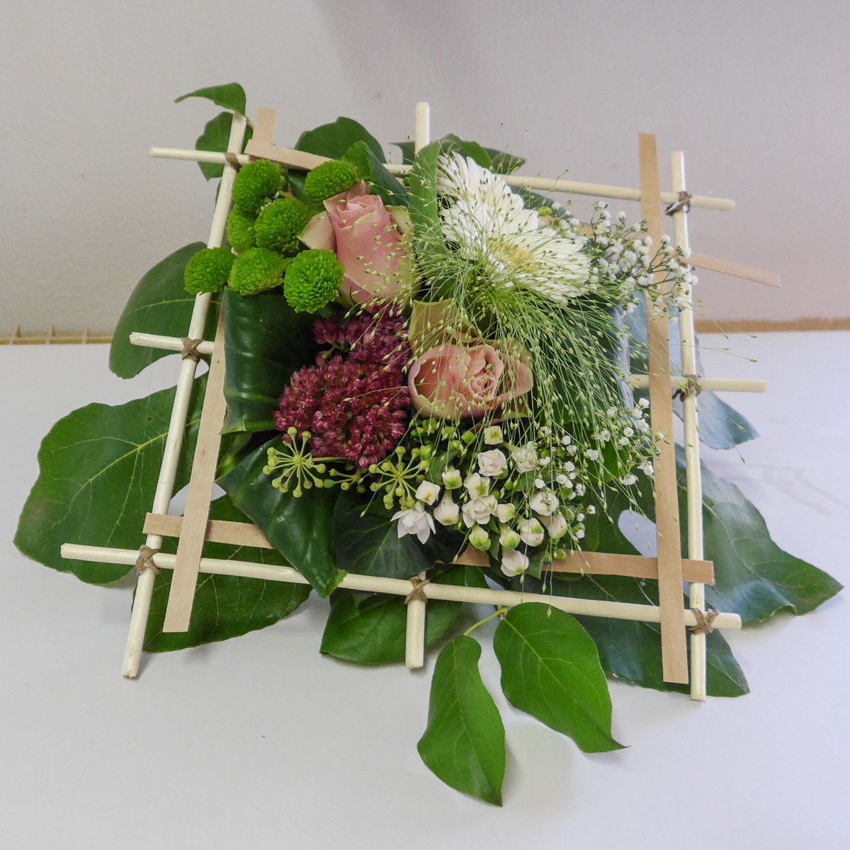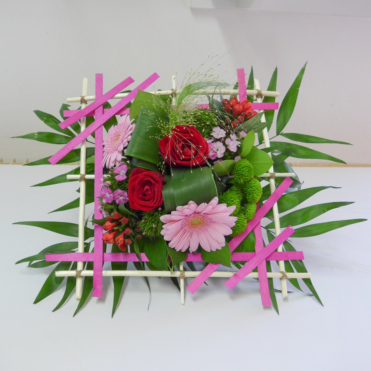Les 3 groupes ont pu réaliser une structure carrée pour y inclure un bouquet coloré grâce aux conseils de Cécile.