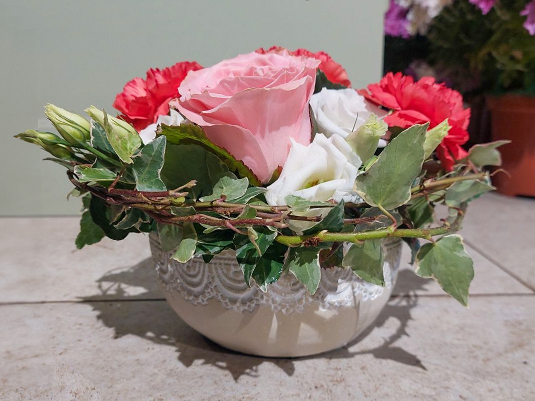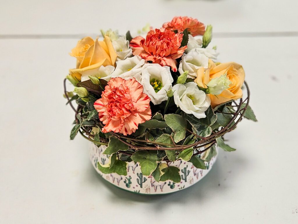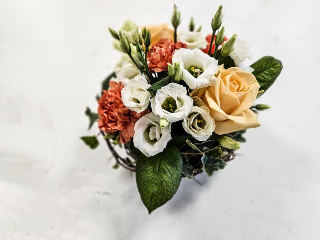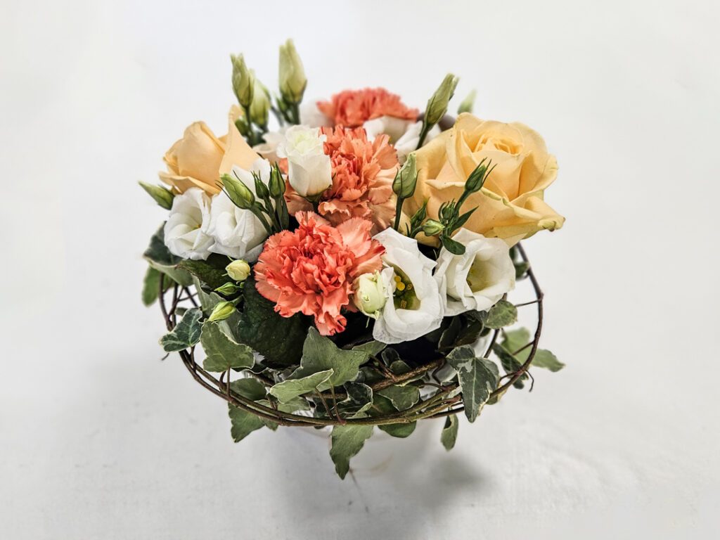 Il est composé de 2 roses pêche, 3 œillets orange, 2 lisianthus blanc, 4 lianes de lierre, le tout piqué dans la mousse florale incluse dans une coupe en céramique ronde d’environ 15 cm de diamètre.