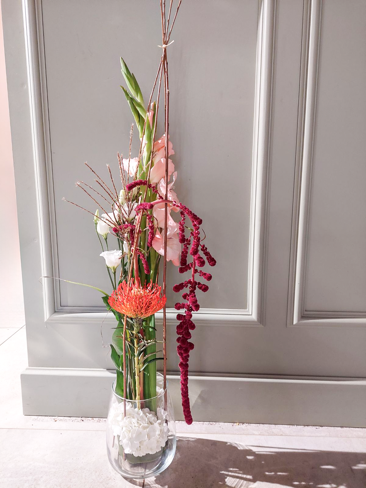 Composition de glaieuls, nutans, lisianthus, hortensia,