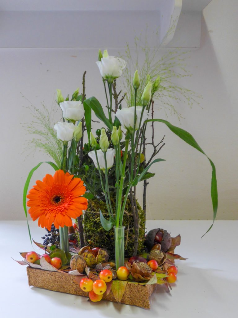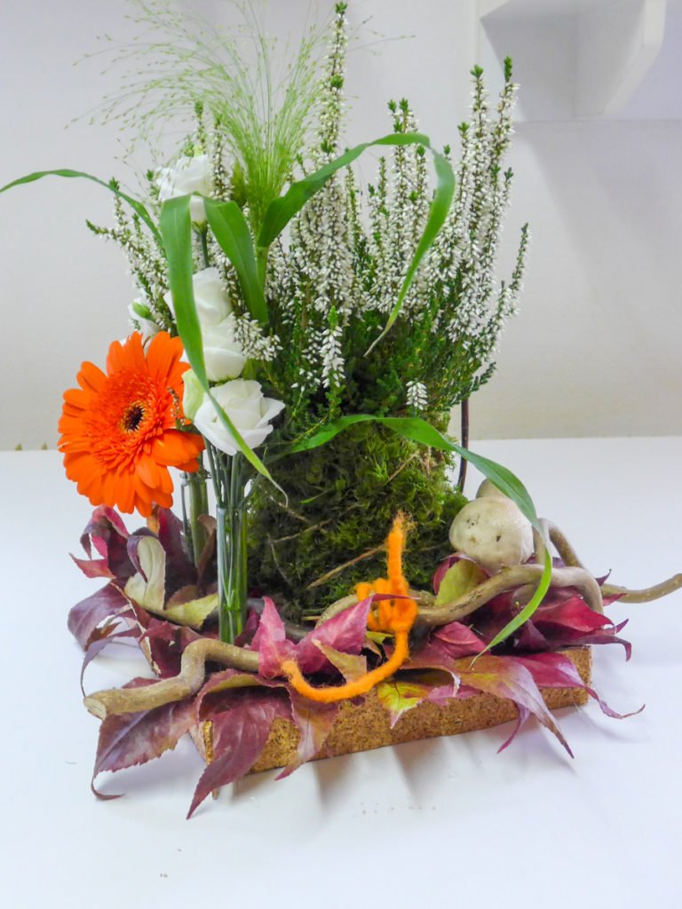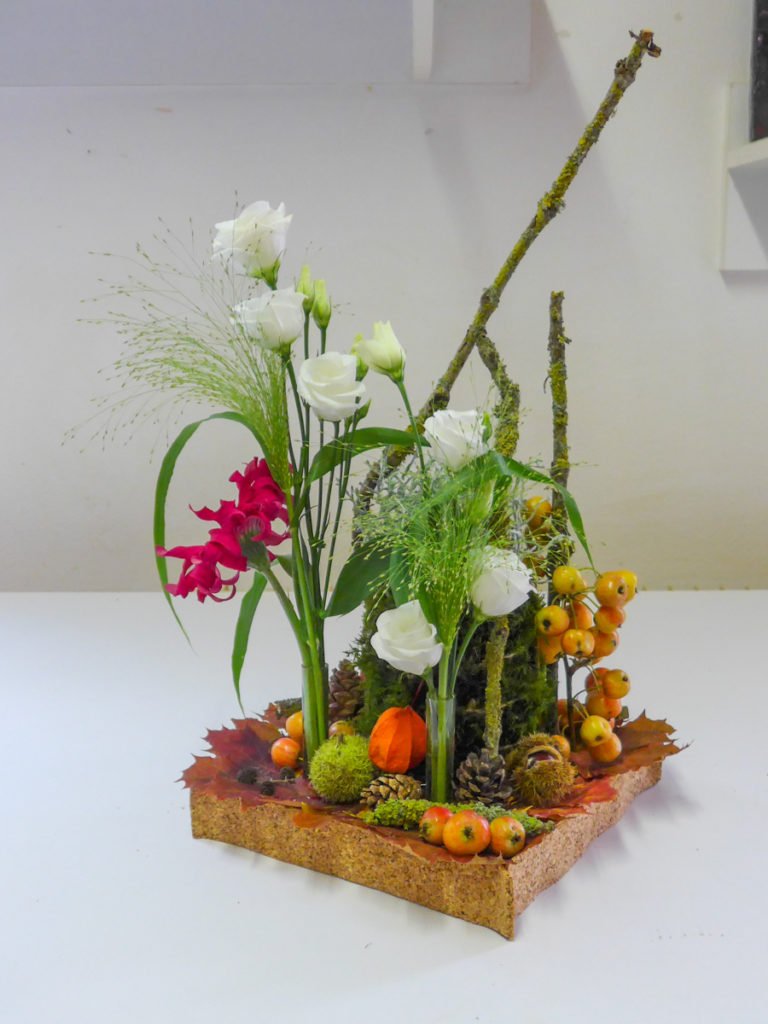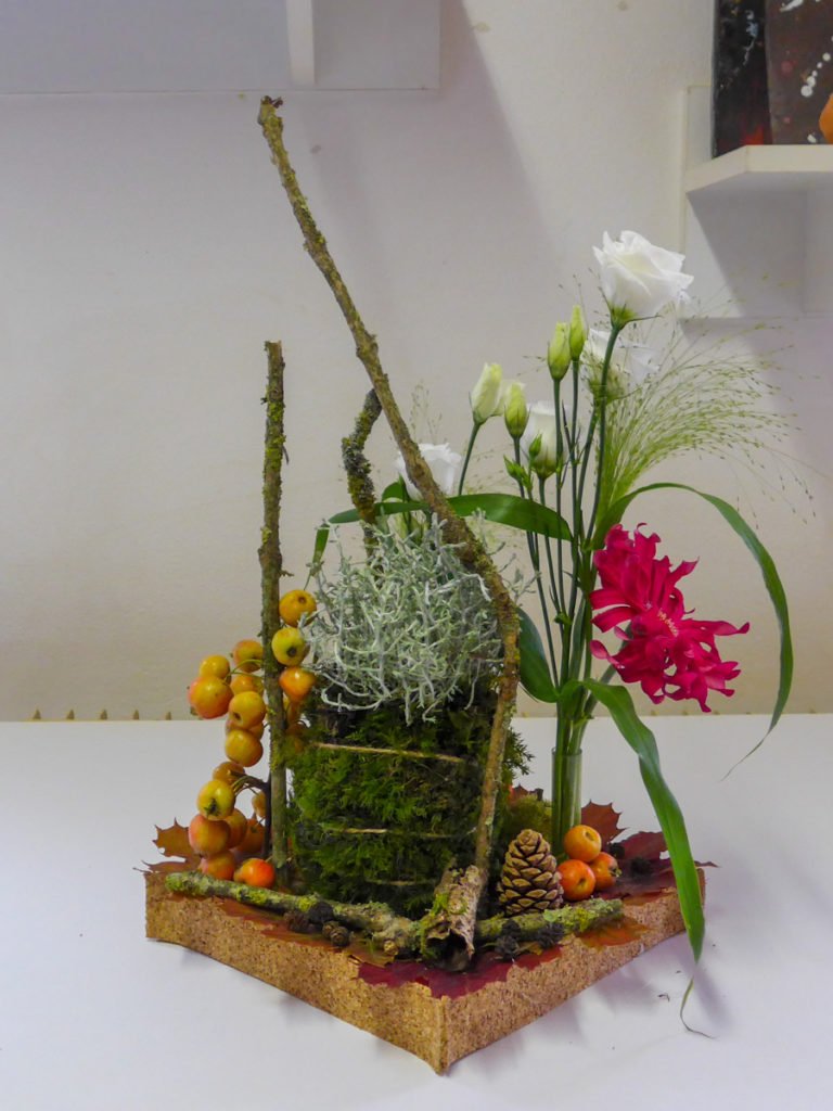 Composition d’automne avec une plante entourée de mousse des bois, des fleurs et des fruits de saisons.