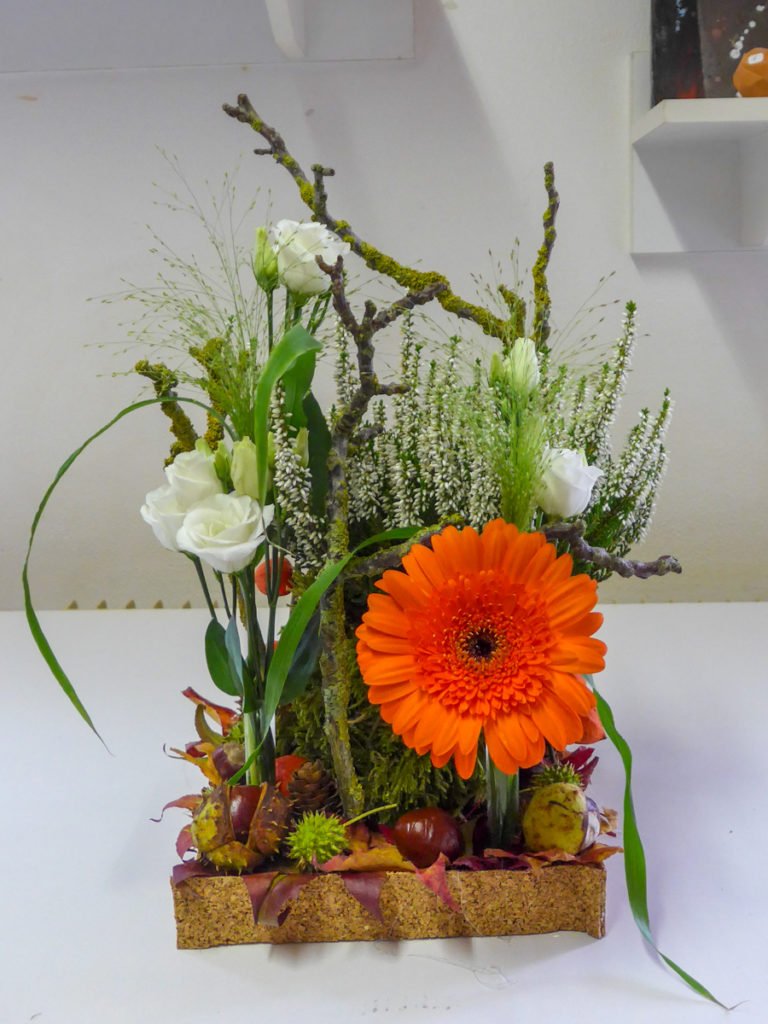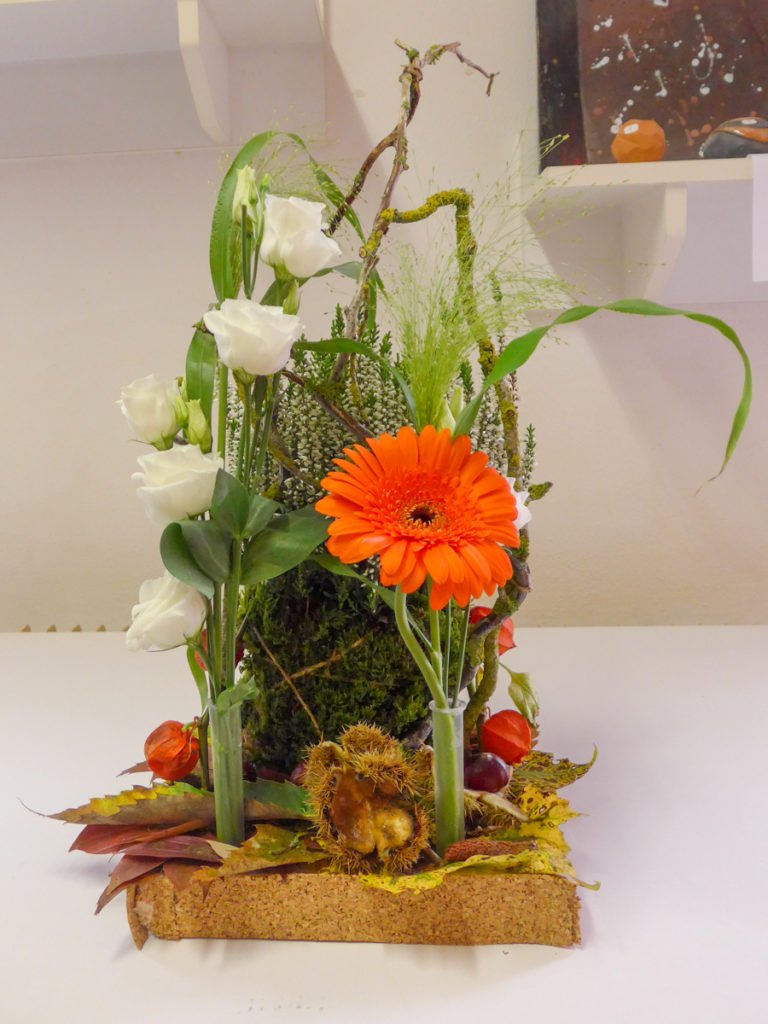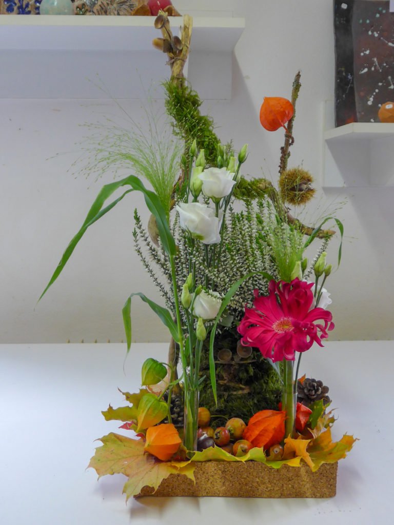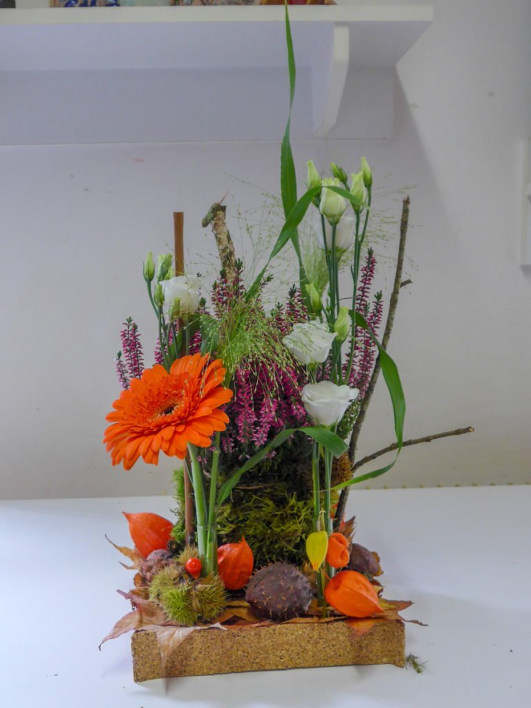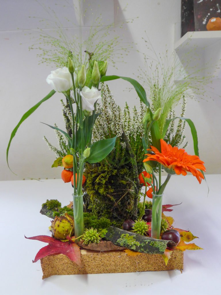 Composition d’automne avec une plante entourée de mousse des bois, des fleurs et des fruits de saisons.