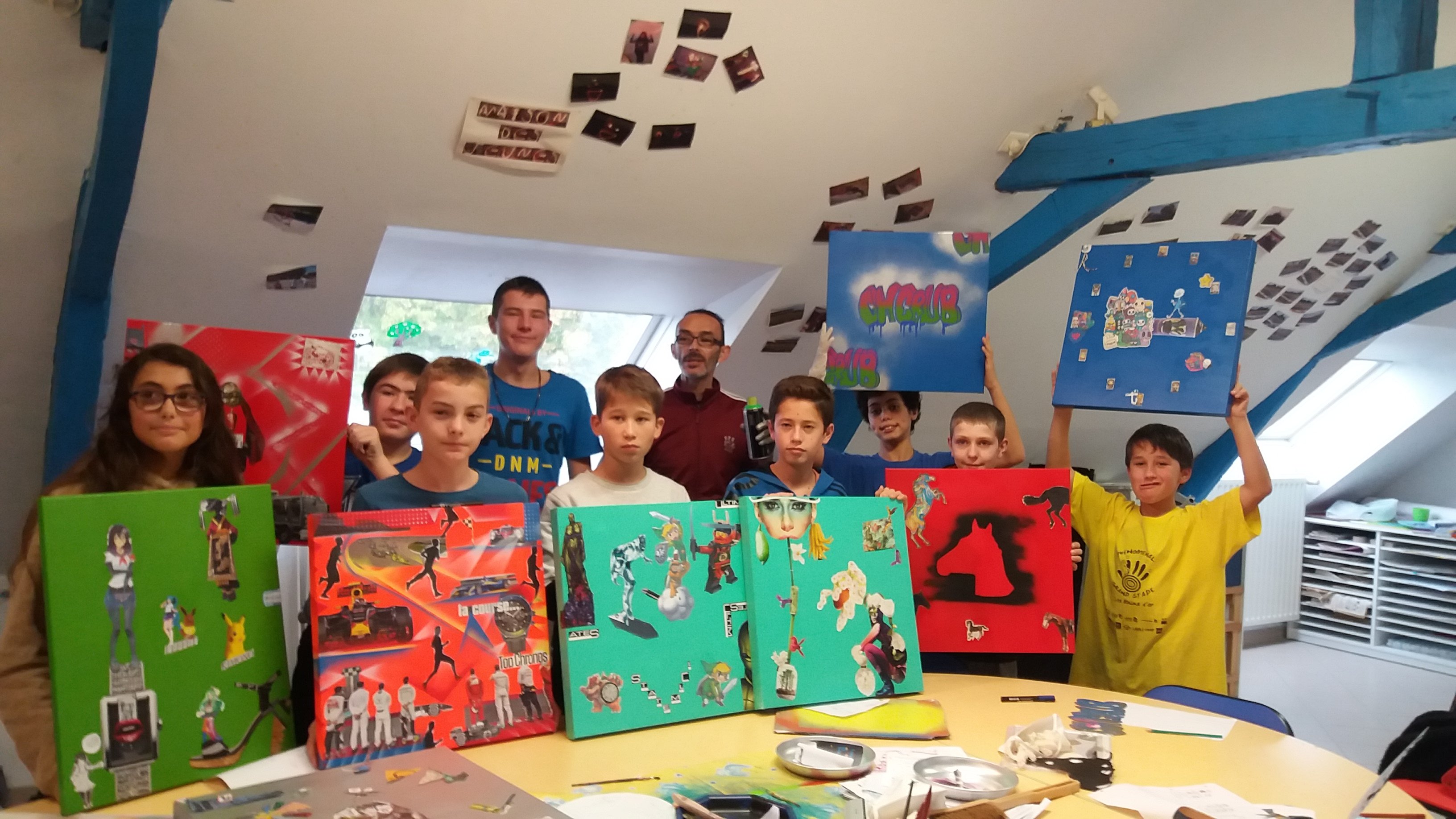 9 jeunes de 11 à 14 ans ont réalisé une toile sous les conseils de SAMESADA artiste changéen. Dès mardi, chacun a choisi son thème : manga, jeux vidéo, sport … A l’aide de bombes, posca, collages, découpages, chaque jeune a évolué à son rythme. Samesada a été attentif à chaque jeune pour l’encourager, le pousser vers des univers inhabituels.
