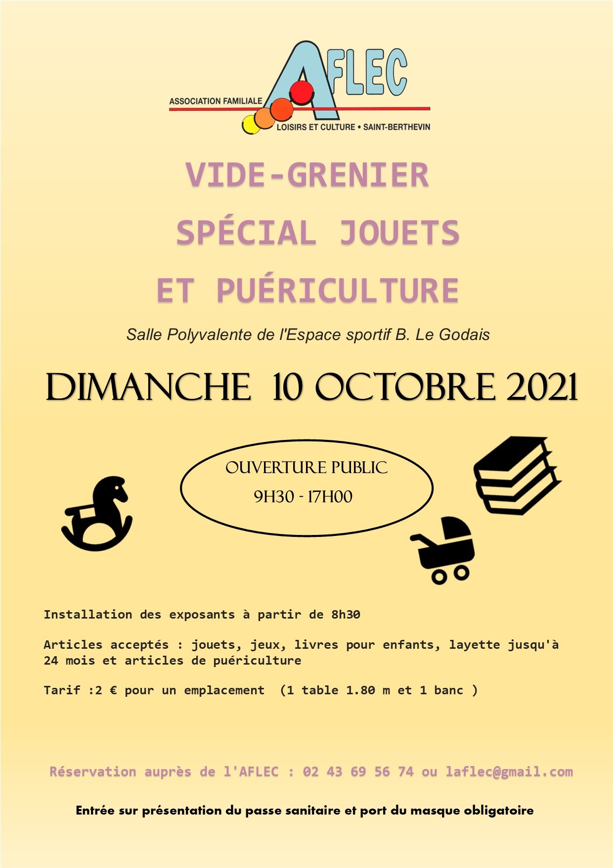 L’Aflec organise un Vide grenier spécial jouets et puériculture le dimanche 10 octobre de 9h30 à 17h00 Salle Polyvalente de l’Espace sportif B. Le Godais.