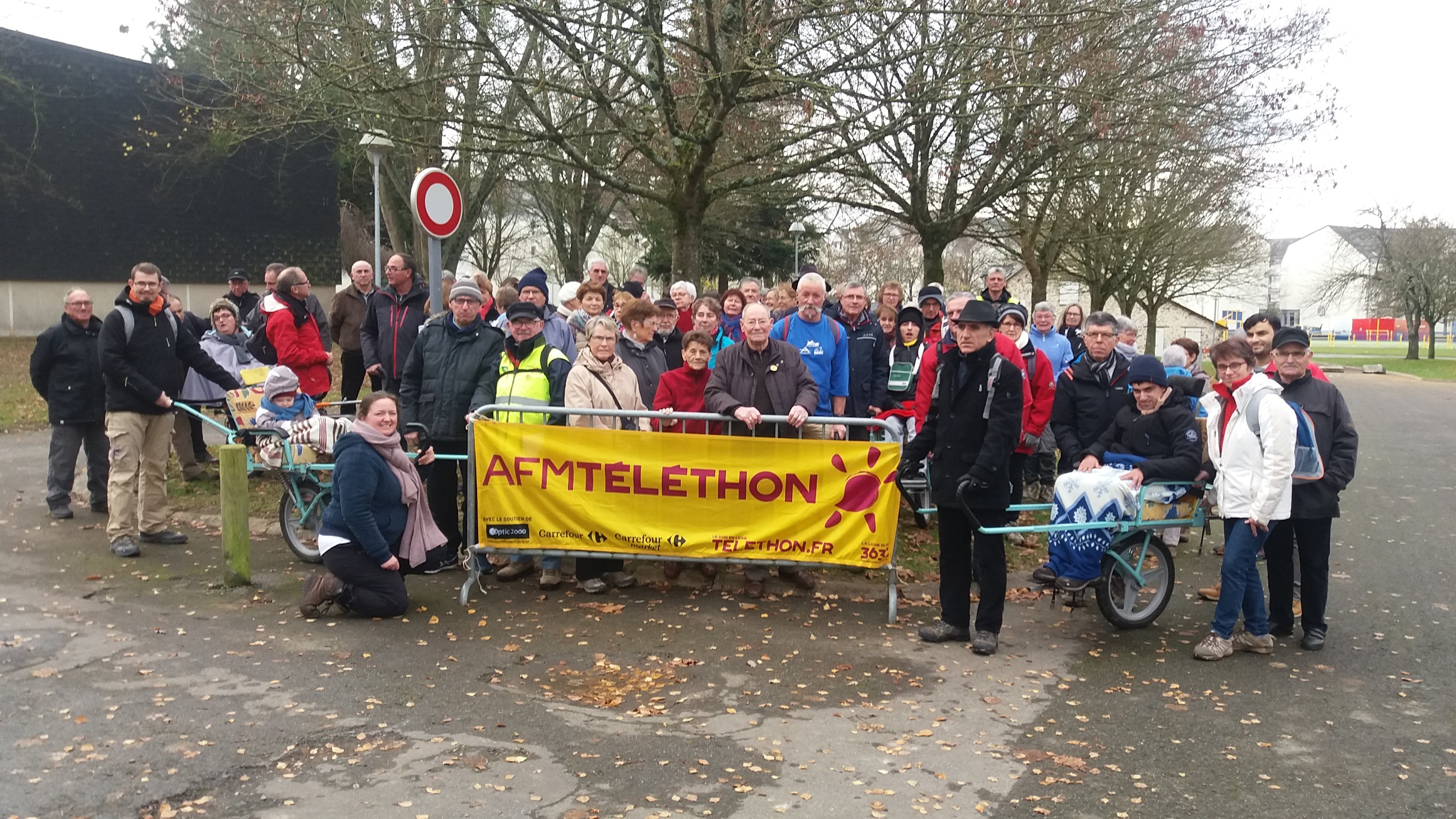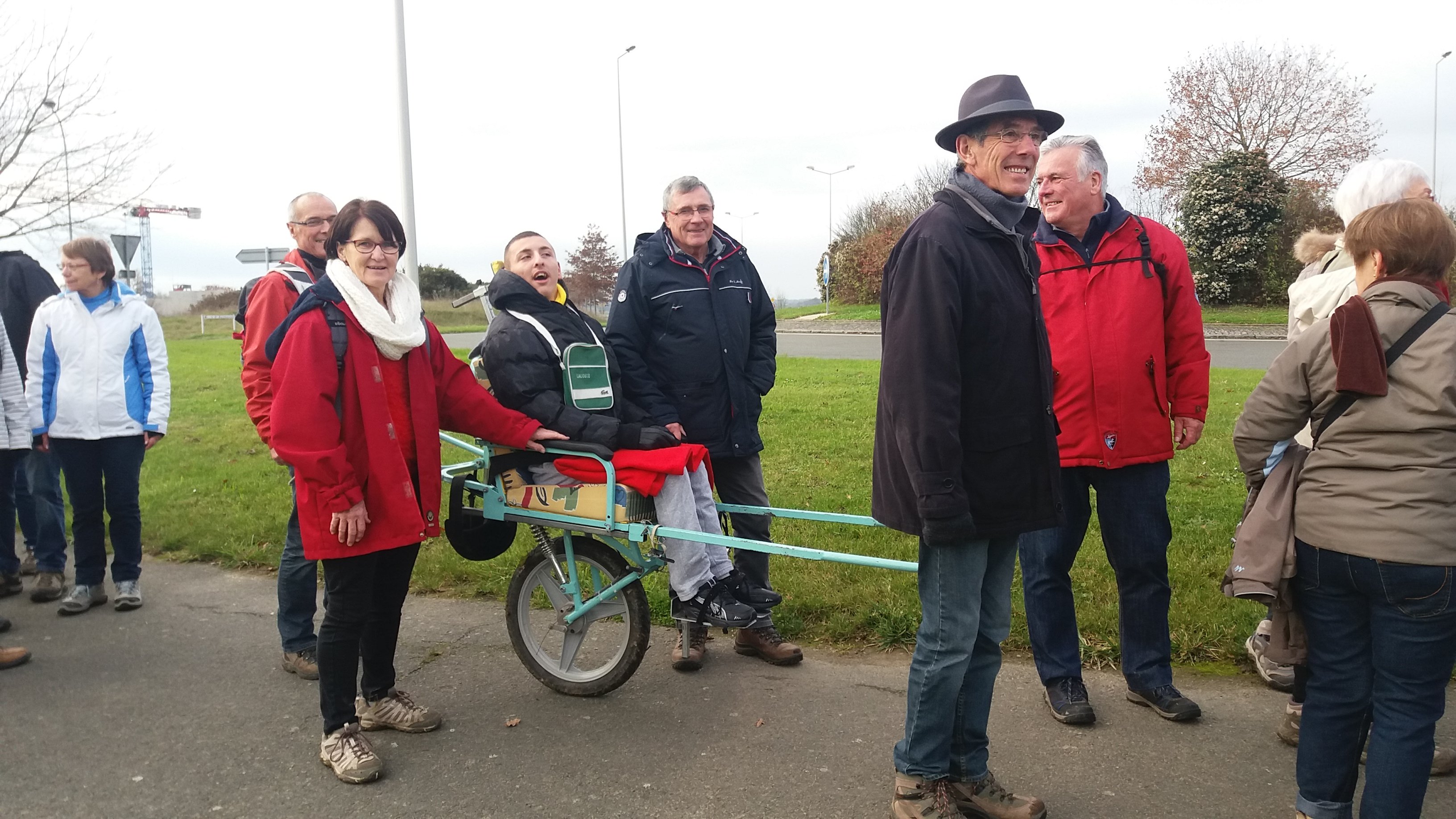 Ce sont 75 personnes qui ont pris le départ pour cette randonnée de 9 km préparée par André Jouannic et Jean Marc Brault au profit du téléthon. Quatre joëlettes de l’association Etincelle 53 s’étaient jointes au groupe. Elles étaient occupées par Raphaelle 5 ans , Quentin 20 ans , Bilal 19 ans , et Véronique 55 ans . Après avoir jeté un coup d’œil sur les différents travaux dans le quartier du Lac, le groupe a emprunté des petits sentiers, en zigzaguant entre les pavillons, sentiers inconnus de beaucoup.